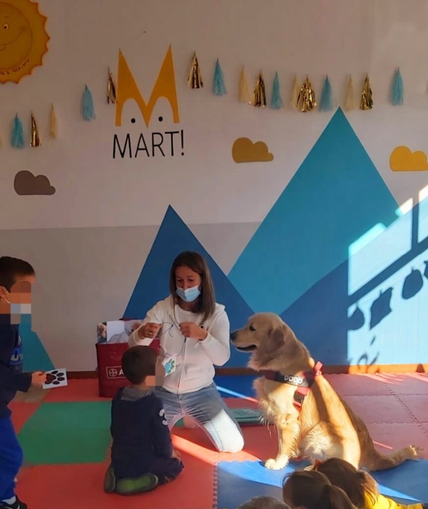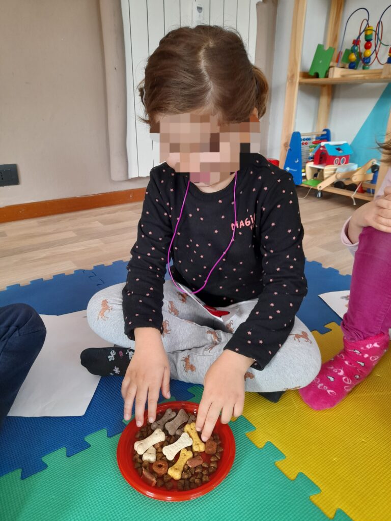 Incontro per promuovere la condivisione del gioco con l’animale e i compagni, stimolare la collaborazione tra i bambini, creare curiosità verso il cane, favorire il corretto comportamento dei bambini verso l’animale , incanalare emozioni verso stati emotivi positivi. Aree coinvolte: emotiva relazionale, sensoriale, motoria.